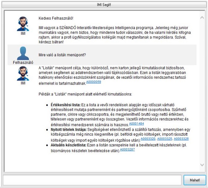 Imi az Ön virtuális ügyfélszolgálati kollégája, aki mindig naprakész tudással áll rendelkezésére, hogy még magabiztosabban és gördülékenyebben használhassa a programot. Azonnal válaszol a kérdéseire, lépésről lépésre végigvezeti a funkciókon, és segít abban, hogy a Számadó szoftverek használata egyszerűbbé, gyorsabbá és hatékonyabbá váljon.